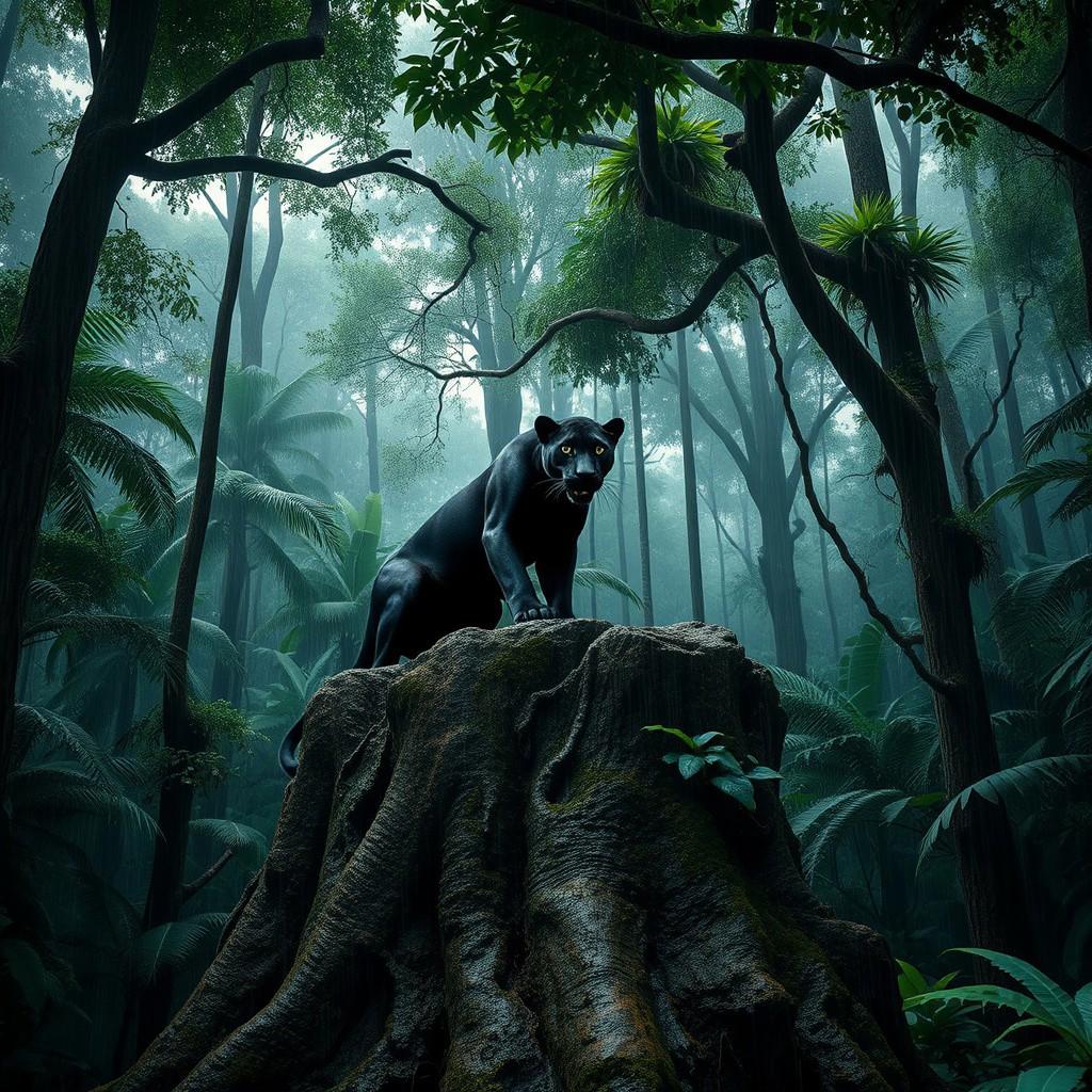 Deep within the dense rainforest, towering trees stretch toward the sky, their thick canopies dripping with rain. The air is humid, filled with the scent of damp earth and the distant calls of unseen creatures. In the heart of this lush wilderness, a massive tree stump, covered in moss and tangled roots, rests beneath the shelter of ancient foliage. Perched atop it, a sleek black panther watches the jungle with piercing green eyes that glow like emeralds in the dim light. Raindrops slide off its glossy fur as it remains perfectly still, blending seamlessly into the shadows. The distant rumble of thunder echoes through the trees, a reminder that in this untamed world, the panther reigns supreme