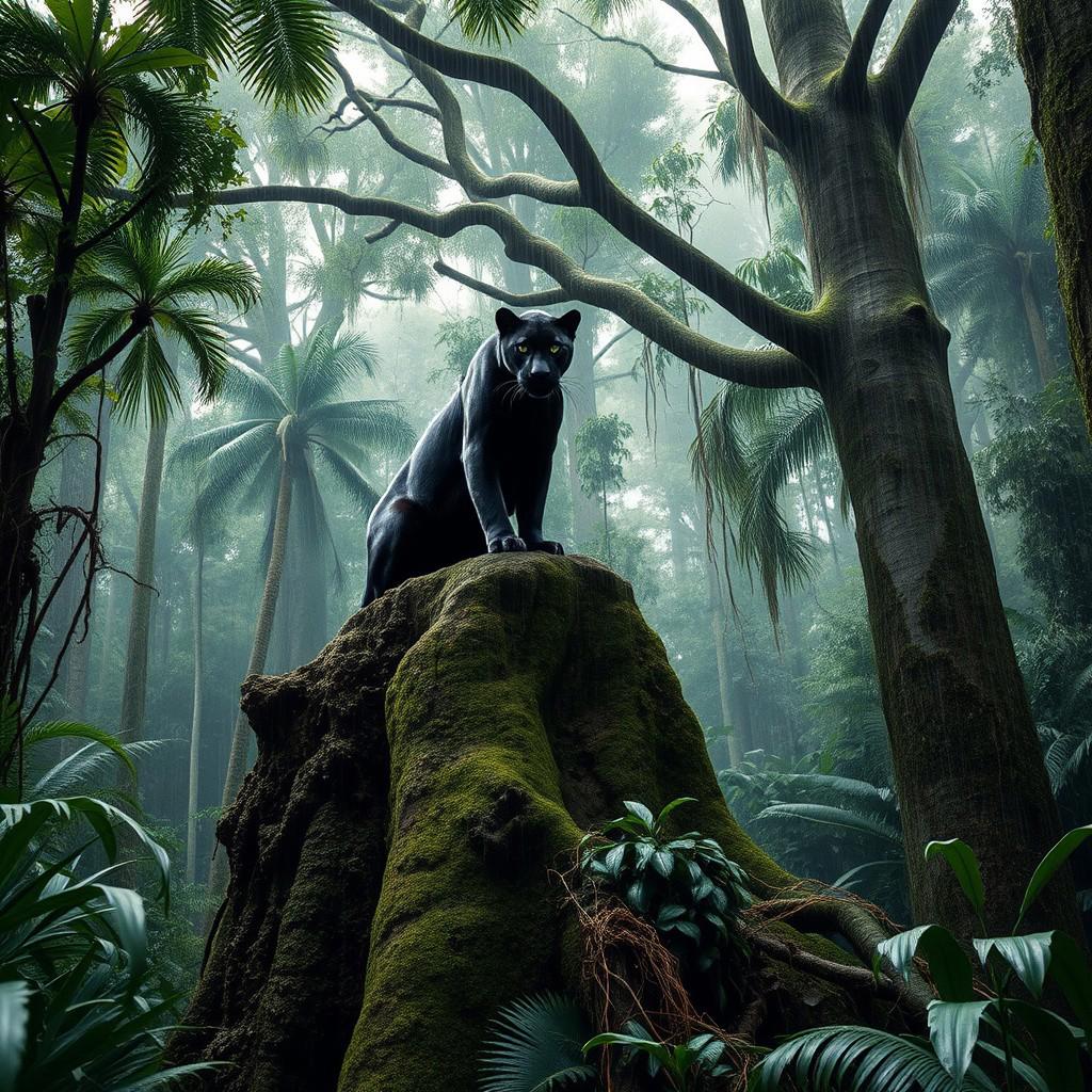 Deep within the dense rainforest, towering trees stretch toward the sky, their thick canopies dripping with rain. The air is humid, filled with the scent of damp earth and the distant calls of unseen creatures. In the heart of this lush wilderness, a massive tree stump, covered in moss and tangled roots, rests beneath the shelter of ancient foliage. Perched atop it, a sleek black panther watches the jungle with piercing green eyes that glow like emeralds in the dim light. Raindrops slide off its glossy fur as it remains perfectly still, blending seamlessly into the shadows. The distant rumble of thunder echoes through the trees, a reminder that in this untamed world, the panther reigns supreme