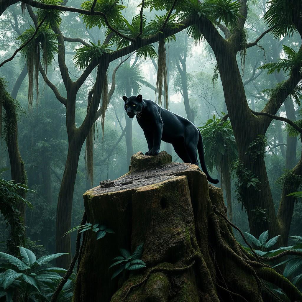Deep within the dense rainforest, towering trees stretch toward the sky, their thick canopies dripping with rain. The air is humid, filled with the scent of damp earth and the distant calls of unseen creatures. In the heart of this lush wilderness, a massive tree stump, covered in moss and tangled roots, rests beneath the shelter of ancient foliage. Perched atop it, a sleek black panther watches the jungle with piercing green eyes that glow like emeralds in the dim light. Raindrops slide off its glossy fur as it remains perfectly still, blending seamlessly into the shadows. The distant rumble of thunder echoes through the trees, a reminder that in this untamed world, the panther reigns supreme