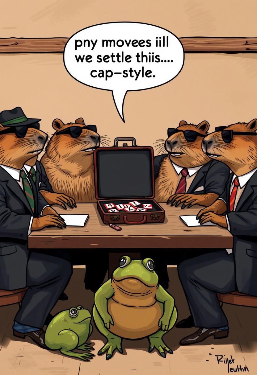 Capybara Mafia Standoff – A group of capybaras in suits and sunglasses are locked in a tense Mexican standoff. One slams a suitcase full of BUZZ on the table, growling, "Nobody moves until we settle this… capy-style." A nervous frog in the corner sweats profusely.