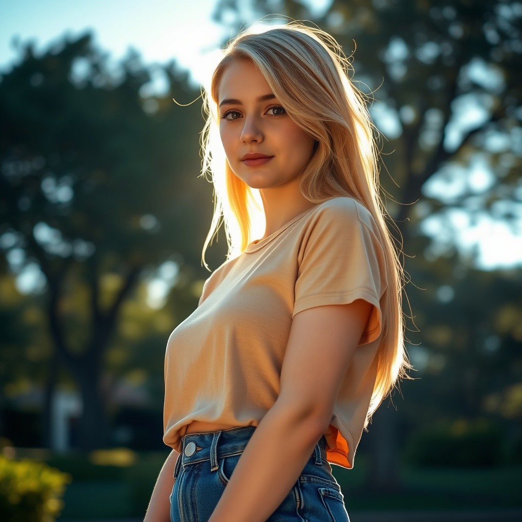 A 20-year-old blonde girl, wearing a t-shirt and high-waisted jeans, standing in a sunlit urban park at golden hour, realistic skin texture, soft natural lighting, detailed background with trees and a clear blue sky, ultra-realistic, 8k resolution, black hair, close view, taken by Canon R5, 85mm lens, best quality, ultra detailed, intricate, professional photography, HDR, High Dynamic Range, (8k UHD), RAW photo <lora:Muatori:1>