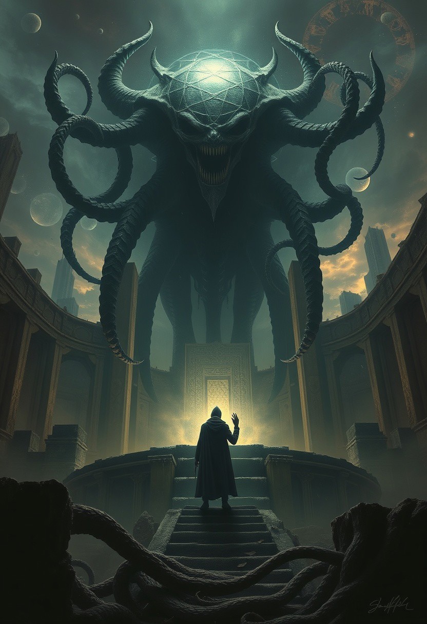 Speaks the Unbeliever's fright., cosmic horror, eldritch, mysterious, otherworldly, dark atmosphere, ancient ruins, forbidden knowledge, shadowy, tentacled entities, surreal, ominous, dread, alien geometries, gothic, arcane symbols, brooding, eerie, unknowable.