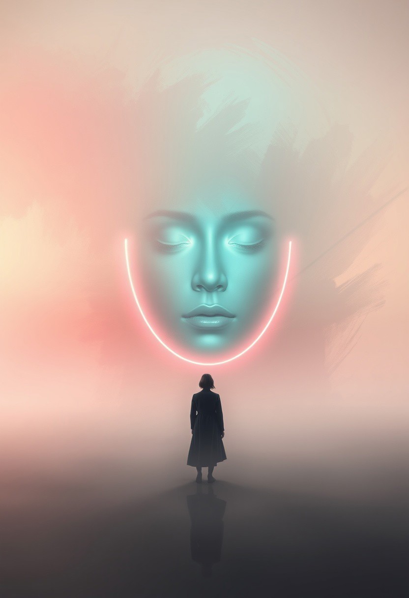 The Dreamer’s Wall , a giant, softly glowing face emerging from abstract color fields, neon light blending into soft pastel gradients, expressive brushstrokes dissolving into a misty, dreamlike haze, minimalist black-and-white photography, ethereal misty landscapes, long exposure water effects, high-contrast monochrome tones, poetic and introspective atmosphere, vast negative space, solitary figures or objects, surreal dreamlike minimalism, soft blurred horizons, cinematic and moody fine art aesthetic