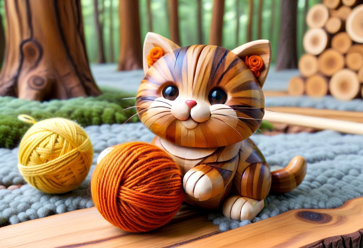 cat, neko, hard wood, score_9, score_8_up, score_7_up, score_6_up, cat made of wood, brown, orange, shiny, playing with yarn ball, shiny, adorable kitty playing in a cloudy forest