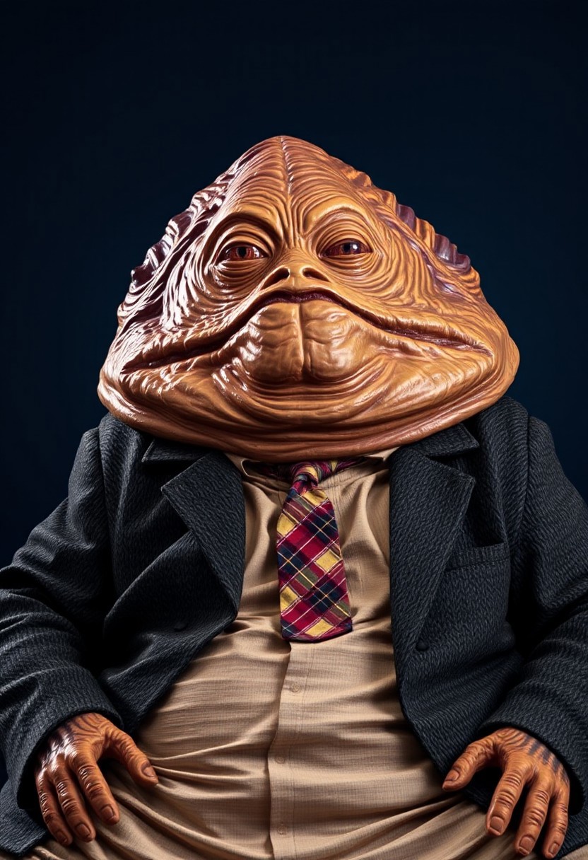 A studio shot hyper-realistic portrait of a Jabba the HUTT alien. He is sat in a dark tweed country jacket, cream shirt and tartan tie against a dark blue backdrop. He looks directly toward the camera. Professional studio portrait photography with classic portrait lighting and shallow depth of field against a seamless backdrop.