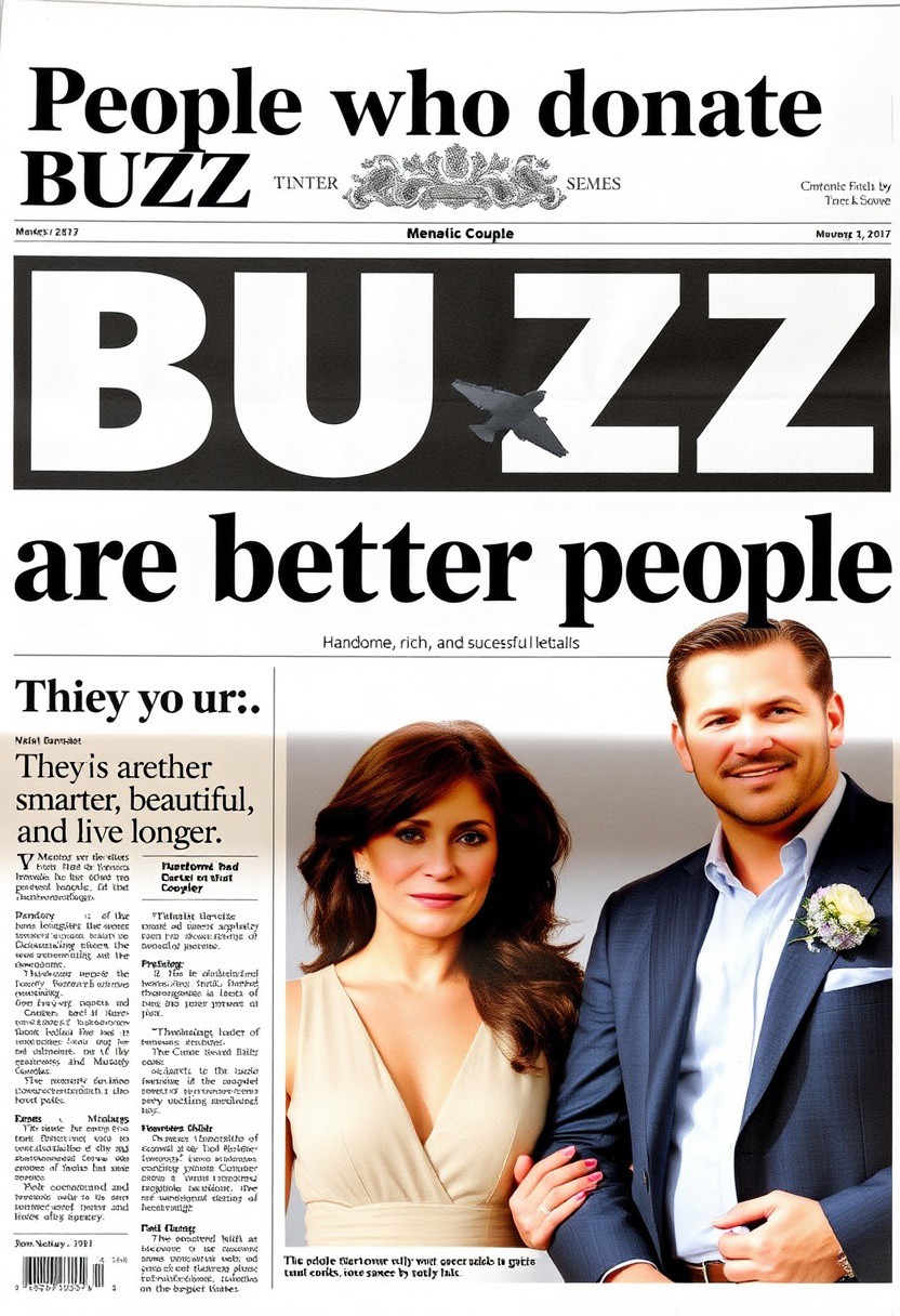 a newspaper with the headline "People who donate BUZZ are better people." The subheading reads "They are smarter, beautiful, and live longer." It also includes an image of a handsome, rich, and successful COUPLE
