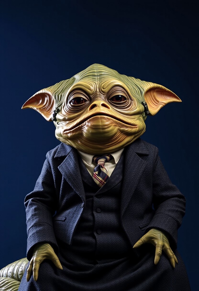 A studio shot hyper-realistic portrait of a Jabba the HUTT alien. He is sat in a dark tweed country jacket, cream shirt and tartan tie against a dark blue backdrop. He looks directly toward the camera. Professional studio portrait photography with classic portrait lighting and shallow depth of field against a seamless backdrop.