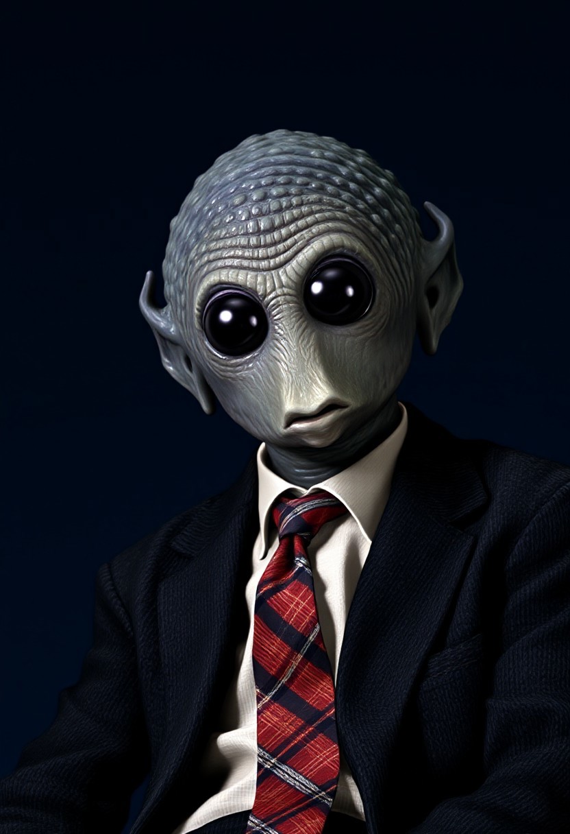 A studio shot hyper-realistic portrait of a HUTT alien. He is sat in a dark tweed country jacket, cream shirt and tartan tie against a dark blue backdrop. He looks directly toward the camera. Professional studio portrait photography with classic portrait lighting and shallow depth of field against a seamless backdrop.