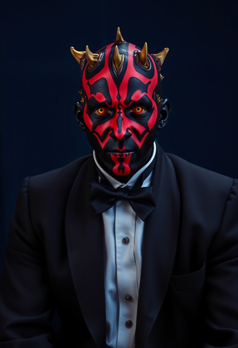 A studio shot hyper-realistic portrait of Darth Maul. He is sat in a formal tuxedo dinner suit. He wear a black jacket, crisp white shirt and black bow tie against a dark blue backdrop. He looks directly toward the camera. Professional studio portrait photography with classic portrait lighting and shallow depth of field against a seamless backdrop.