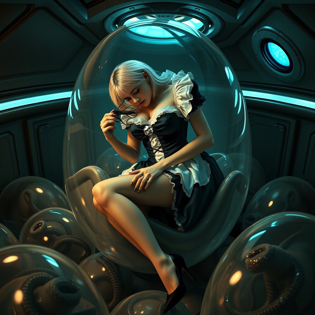 Blonde French maid in a flirty, corseted black satin maid outfit with white ruffles, lace trim, and a sparkling silver brooch, paired with high heels, helpless and contorted in a slimy, transparent xenomorph egg, its translucent walls revealing sticky, liquid-like tendrils. A facehugger latched onto her porcelain-like face, as she's curled up in agony, amidst a nest of similar, giant transparent eggs containing dormant maidens. The eerie, dimly-lit UFO interior serves as a backdrop, with metallic walls, sci-fi panels, and an observation blister glowing with an otherworldly blue light. Inspired by H.R. Giger's dark, biomechanical style and the horror of the Alien franchise, with a cinematic, film-noir aesthetic.assistant In a sleek, dimly-lit, metallic UFO cabin interior observation blister illuminates with a blue glow envelope giant eggs, transparent walls, encased beauties, milky bio-secrets. Dark Alien-esque setting in style of H.R. Giger Yamaguchi and Andy Park live-action photorealistic atmospheric cinematic masterpiece - constituted with textured film-like grain grainy vignette. On-set, cinematic movie lighting, 35mm 2.35:1 theatrical movie frame saw-tooth audio speakers torn dark muted moody synthesizer ambiance crashes when the floating vaporous security sensor alarm fails