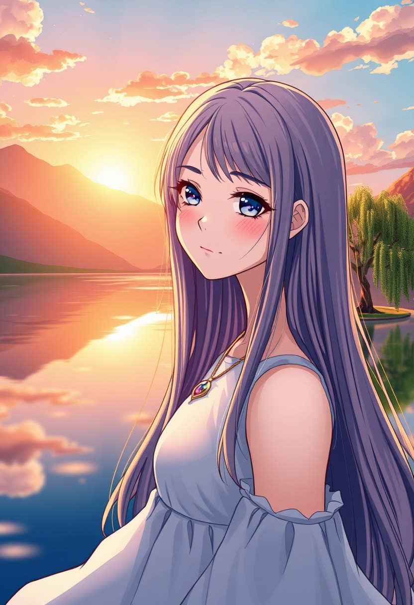 1 girl, serene expression, mesmerizing eyes, straight long hair, flowing dress, poised posture, porcelain skin, subtle blush, crystal pendant BREAK golden hour, (rim lighting):1.2, warm tones, sun flare, soft shadows, vibrant colors, painterly effect, dreamy atmosphere BREAK scenic lake, distant mountains, willow tree, calm water, reflection, sunlit clouds, peaceful ambiance, idyllic sunset, ultra detailed, official art, unity 8k wallpaper , zentangle, mandala