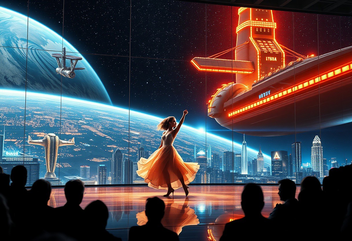 immaculately detailed realistic ultra quality image of a beautiful elegant female dancer and male counterpart are dancing on a futuristic stage micro-LED lighted, the dancer is the focus of the image, every detail of her dress and body are fully visible, the height of the image, behind the dancer on the stage is an enormous seamless and futuristic wall to wall and floor to ceiling window that looks out at a the planet's surface covered with the lights of enormous buildings and cities, An enormous deco starship with futuristic lighting and an enormous space station are visible in the background among the stars, Artistic art deco, dynamic perspective, (((overall architectural aesthetic is Art Deco Cyberpunk))). Epic image that elicits a feeling of romanticism, wonder, and awe, the silhouette of the audience can be seen in the foreground that show the enormous scale of the stage and seamless window behind it,