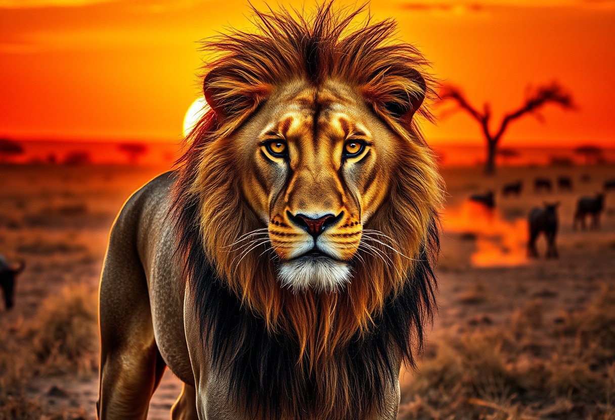 "Masterpiece, best quality, highres, ultra-detailed, cinematic lighting. A majestic lion stands in the heart of the sun-scorched savanna, staring directly at the viewer with piercing golden eyes. Its powerful frame is accentuated by the warm glow of the setting sun, casting long shadows over the dry grass. The lion’s thick, flowing mane ripples in the wind, a mix of deep amber, tawny brown, and hints of black. Muscles ripple beneath its sleek fur, each detail meticulously rendered, from the faint battle scars on its muzzle to the subtle dust clinging to its coat. The savanna stretches endlessly behind it, with acacia trees silhouetted against the fiery hues of the dusk sky. Wisps of dust rise from the cracked earth, swirling in the soft breeze. A few distant silhouettes of wildebeests and zebras graze under the fading light, their presence barely noticeable against the vast horizon. The lion’s expression is regal, unwavering, exuding both dominance and wisdom an apex predator, yet a guardian of the land. The atmosphere is tense, as if the lion is studying its observer, deciding whether to attack or simply acknowledge their presence. The composition is perfectly balanced, with the lion slightly off-center, drawing immediate focus to its intense gaze and the intricate details of its face and mane."