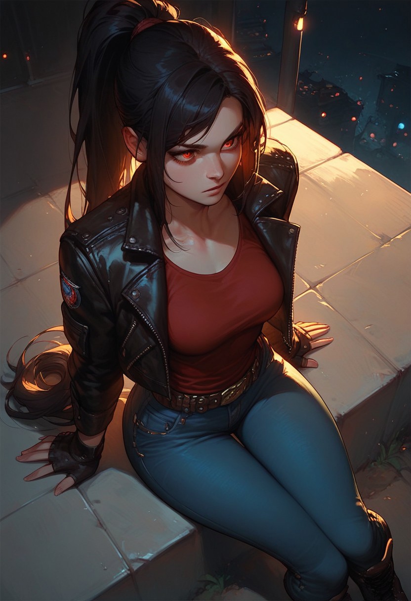 score_8_up, score_7_up , score_9, black hair, long hair, ponytail, solo, red eyes, dynamic lighting, medium breasts, leather jacket, red tanktop, jeans, combat boots, sitting, dynamic angle, night, cowboy shot, hips sway, focused face,