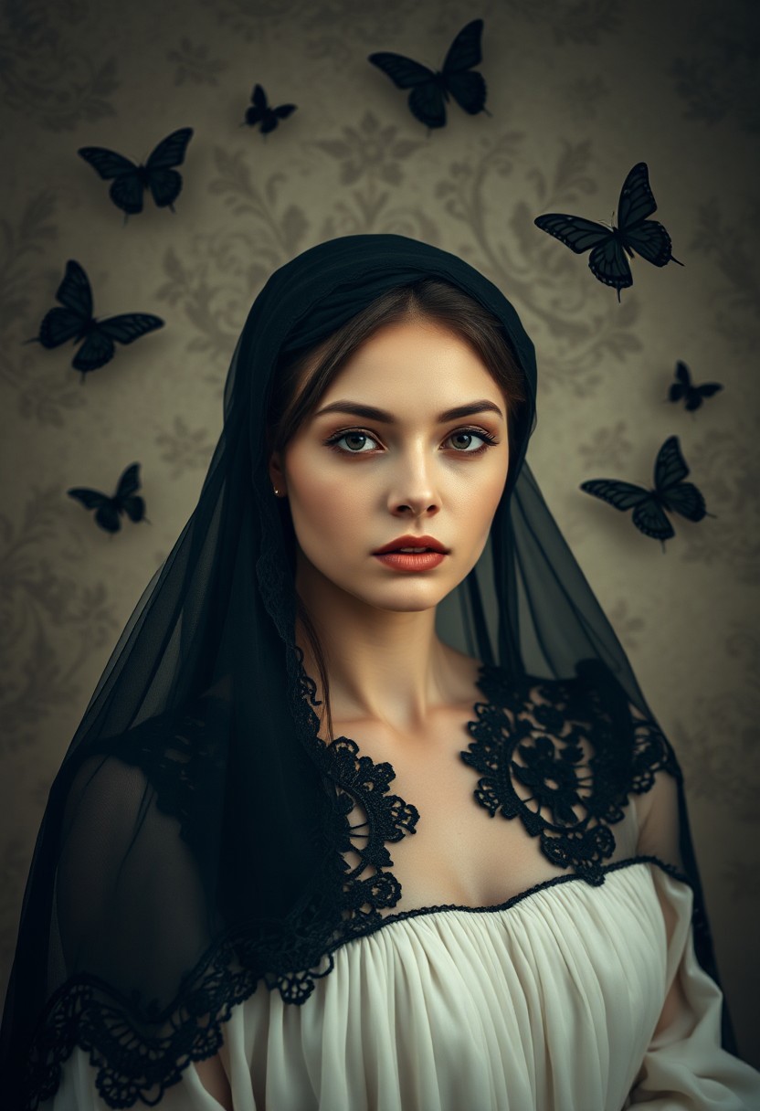 elegant woman, black veil, ivory gown, black lace, gothic romance, melancholic mood, dark butterflies, soft textured background, botanical motifs, dreamlike atmosphere, serene expression, poetic composition, introspective mood, fantasy portrait, romantic gothic style, surreal conceptual photography, cinematic storytelling, highly staged dreamlike compositions, crisp painterly precision, imaginative and unexpected elements, vintage-inspired aesthetics, retro-futuristic color palette, soft pastels with deep contrasts, mid-century modern influences, whimsical yet sophisticated atmosphere