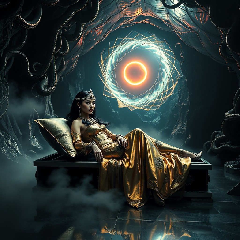Regal high-society elegant slender lady, draped in opulent attire, shrouded in glistening, translucent, metallic-tinged slime-foil layers, accentuating her haughty demeanor, adorned with sleek, silver, stiletto heels and an otherworldly, bioluminescent mind control headband, reclines on black, glossy, slime-encrusted pillows within an ancient Egyptian sarcophagus, enveloped by a transparent, glistening slime ceiling, situated at the heart of a mystical, subterranean cavern, surrounded by sinuous, pulsing tentacles, as a colossal, swirling portal to the cosmos looms in the background, shrouded by a labyrinthine network of iridescent slime webs, wispy fog wafts from the polished, steel floor, illuminated by the faint, crimson glow of a macabre, lunar eclipse, evoking a sense of foreboding, inspired by the dark, biomechanical, surrealistic style of H.R. Giger and the epic, cinematic grandeur of Steven Spielberg, with the gritty, high-contrast aesthetic of a 35mm film still, shot on a v-raptor XL camera, with pronounced film grain, vignette, and a rich, cinematic color palette, post-processed to perfection, exuding an atmosphere of eerie, sci-fi horror.