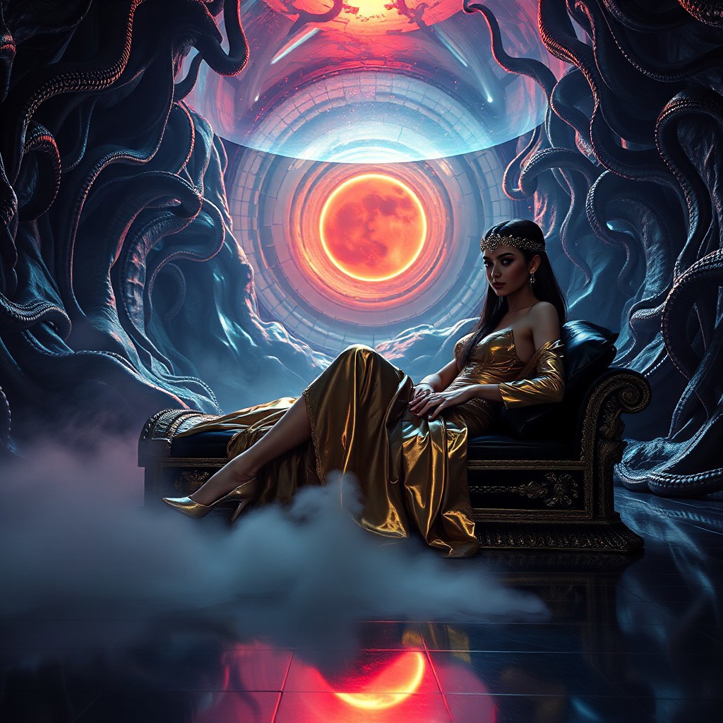 Regal high-society elegant slender lady, draped in opulent attire, shrouded in glistening, translucent, metallic-tinged slime-foil layers, accentuating her haughty demeanor, adorned with sleek, silver, stiletto heels and an otherworldly, bioluminescent mind control headband, reclines on black, glossy, slime-encrusted pillows within an ancient Egyptian sarcophagus, enveloped by a transparent, glistening slime ceiling, situated at the heart of a mystical, subterranean cavern, surrounded by sinuous, pulsing tentacles, as a colossal, swirling portal to the cosmos looms in the background, shrouded by a labyrinthine network of iridescent slime webs, wispy fog wafts from the polished, steel floor, illuminated by the faint, crimson glow of a macabre, lunar eclipse, evoking a sense of foreboding, inspired by the dark, biomechanical, surrealistic style of H.R. Giger and the epic, cinematic grandeur of Steven Spielberg, with the gritty, high-contrast aesthetic of a 35mm film still, shot on a v-raptor XL camera, with pronounced film grain, vignette, and a rich, cinematic color palette, post-processed to perfection, exuding an atmosphere of eerie, sci-fi horror.