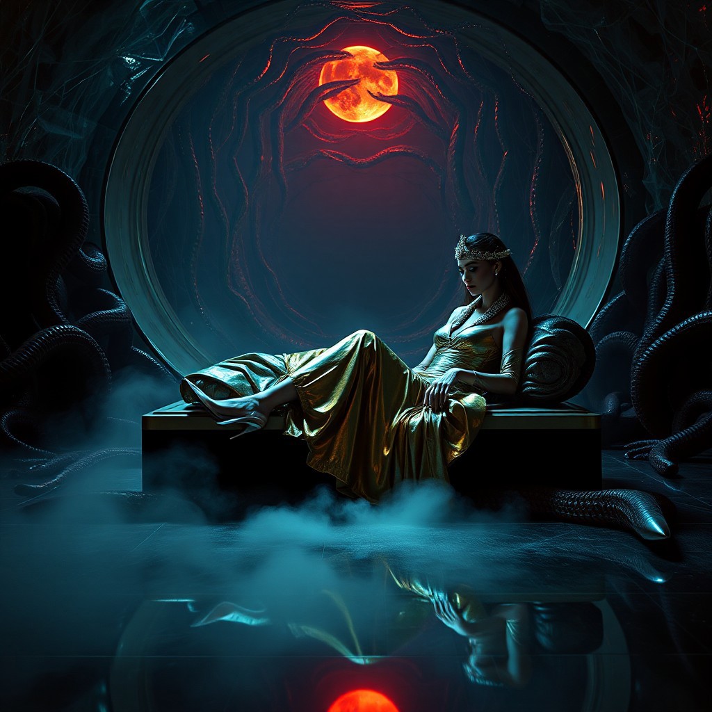 Regal high-society elegant slender lady, draped in opulent attire, shrouded in glistening, translucent, metallic-tinged slime-foil layers, accentuating her haughty demeanor, adorned with sleek, silver, stiletto heels and an otherworldly, bioluminescent mind control headband, reclines on black, glossy, slime-encrusted pillows within an ancient Egyptian sarcophagus, enveloped by a transparent, glistening slime ceiling, situated at the heart of a mystical, subterranean cavern, surrounded by sinuous, pulsing tentacles, as a colossal, swirling portal to the cosmos looms in the background, shrouded by a labyrinthine network of iridescent slime webs, wispy fog wafts from the polished, steel floor, illuminated by the faint, crimson glow of a macabre, lunar eclipse, evoking a sense of foreboding, inspired by the dark, biomechanical, surrealistic style of H.R. Giger and the epic, cinematic grandeur of Steven Spielberg, with the gritty, high-contrast aesthetic of a 35mm film still, shot on a v-raptor XL camera, with pronounced film grain, vignette, and a rich, cinematic color palette, post-processed to perfection, exuding an atmosphere of eerie, sci-fi horror.