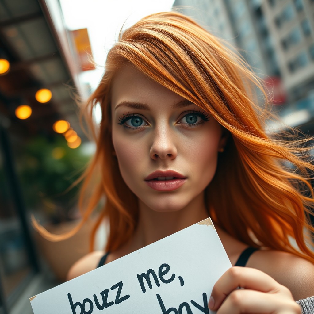 A beautiful orange-haired woman holding a sign that says "buzz me, baby," dutch angle, focus on face, big blue eyes, begging expression