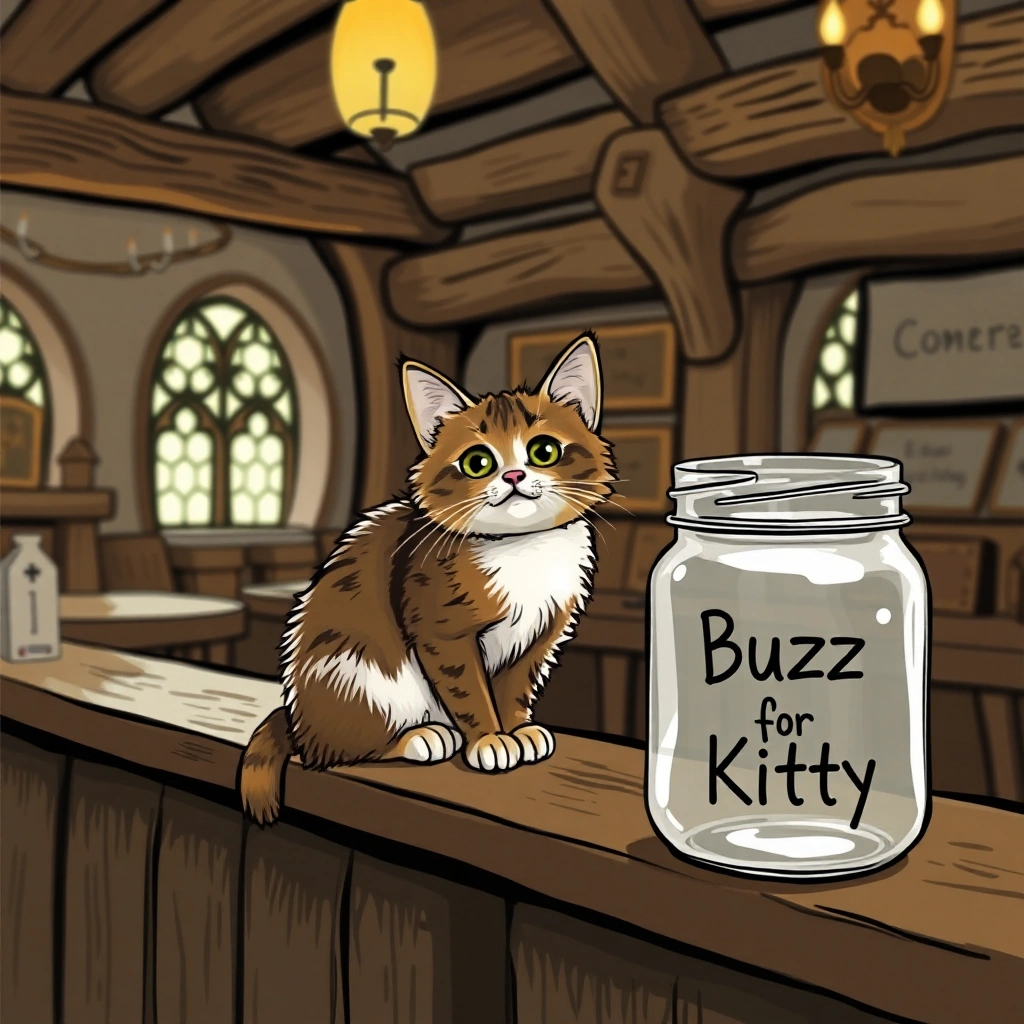 A cute cat sits on a bar in a medieval tavern, there is an empty jar next to it that says "Buzz for Kitty."