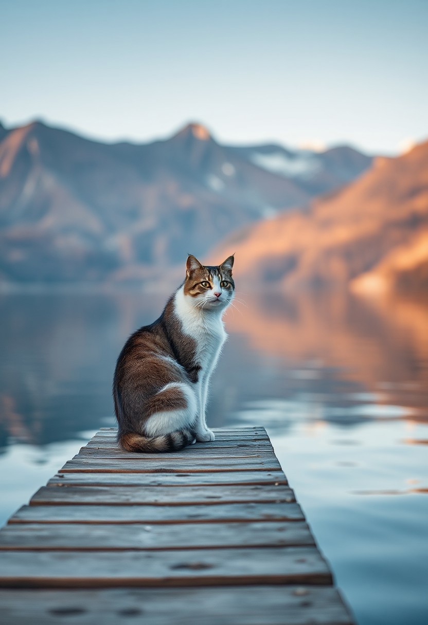 (Soft Lighting Photography by Mimoza Veliu and Mario Giacomelli:1.2), NSFW, Cinematic photography. A photo-realistic shoot of a cat sitting at the end of a jetty on tranquil mountain lake, with mountains in the background,.