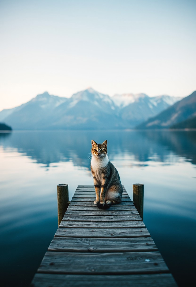 (Soft Lighting Photography by Mimoza Veliu and Mario Giacomelli:1.2), NSFW, Cinematic photography. A photo-realistic shoot of a cat sitting at the end of a jetty on tranquil mountain lake, with mountains in the background,.