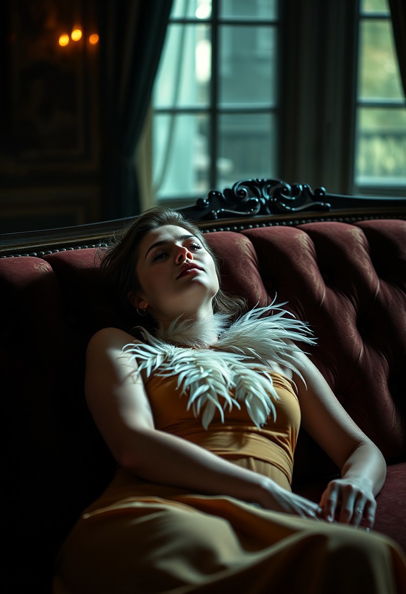 a woman lying down in a luxurious sofa in a présidentiel house like roman or french castle , have Feathers on her neck , dramatic light