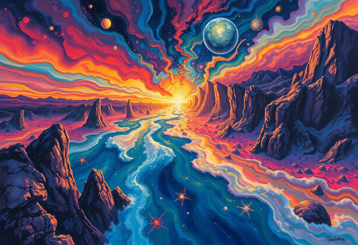 gouache painting about In the unpublished and breathtaking image far beyond the unseeable by syd mead, the essence of the Master's artistry shines through with remarkable clarity. As your eyes wander across the canvas, you'll encounter a harmonious fusion of elements that defy convention and ignite the imagination. It is a visual symphony that stands as a testament to meads boundless creativity. Vibrant and sublime colors dominate the image, bursting forth with a luminosity that captivates the viewer.,
