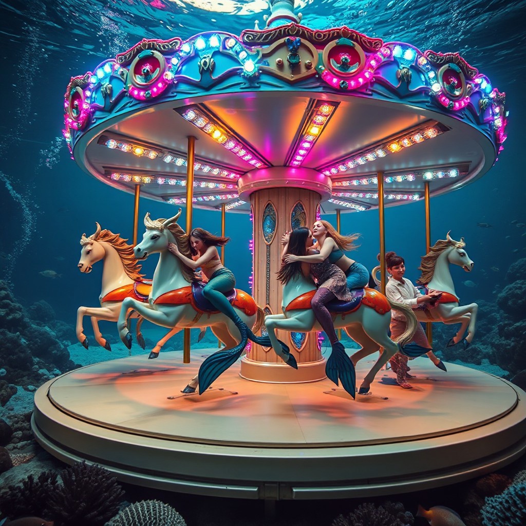 sea floor, an underwater amusement park, a merry-go-round with ride seats placed on classy figures of centaurs and dryads made of ivory and jade, cute mermaids having a frolicking joyride hugging those figures by the neck, merry-go-round is studded with colored electric bulbs and lit like a Christmas tree, colored inky or fluorescent streams or air bubbles emanating from sea floor, eels and schools of fishes on the background, atmosphere of joy and spinning,