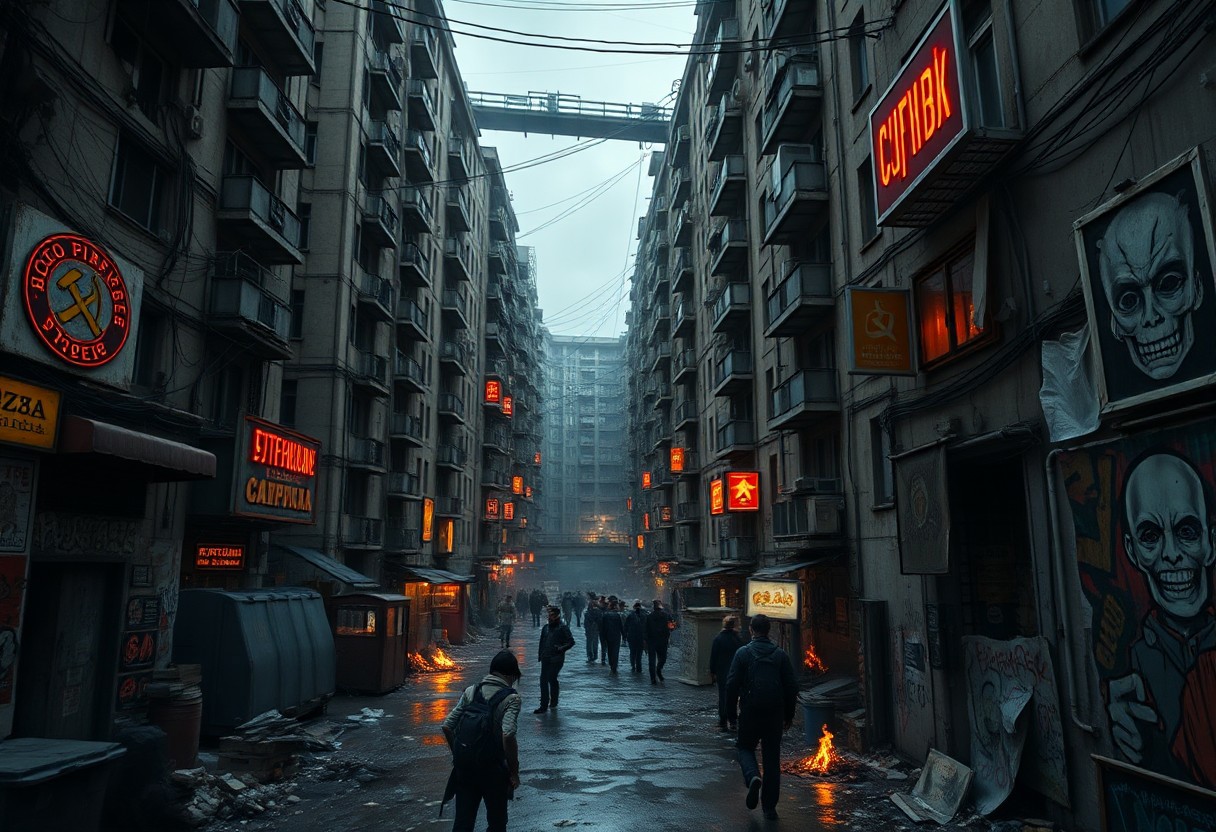 A hyper-detailed labyrinth of crumbling Soviet-era concrete tenements draped in frayed electrical cables and flickering neon signs in Cyrillic script. Puddles of oily rainwater reflect the orange glow of trash-can fires, smoke hangs low, and the hum of broken electricity buzzes in the air. Shadowy figures huddle in alleyways, faces obscured by cracked gas masks or grime-stained rags, their postures tense. Graffiti of grotesque, grinning faces peels off every wall, revealing layers of decaying propaganda posters. Above, a collapsed skybridge hangs mid-air, rusted rebar exposed like skeletal fingers. (Inspired by "post-apocalyptic urban decay with a gritty, textured aesthetic"). Quality: Finest details, crispy and grainy textures with micro-contrast, natural gradient noise, light glares from fires, caustics in water reflections, subsurface scattering on smoke. Color palette: True-to-life photorealism with a digital SLR’s dynamic range—rust orange, grimy mustard yellow, deep asphalt blacks, and desaturated crimson. Note the muted contrast where frontal sunlight bleaches textures. Mood: Chaotic, desperate, claustrophobic decay.