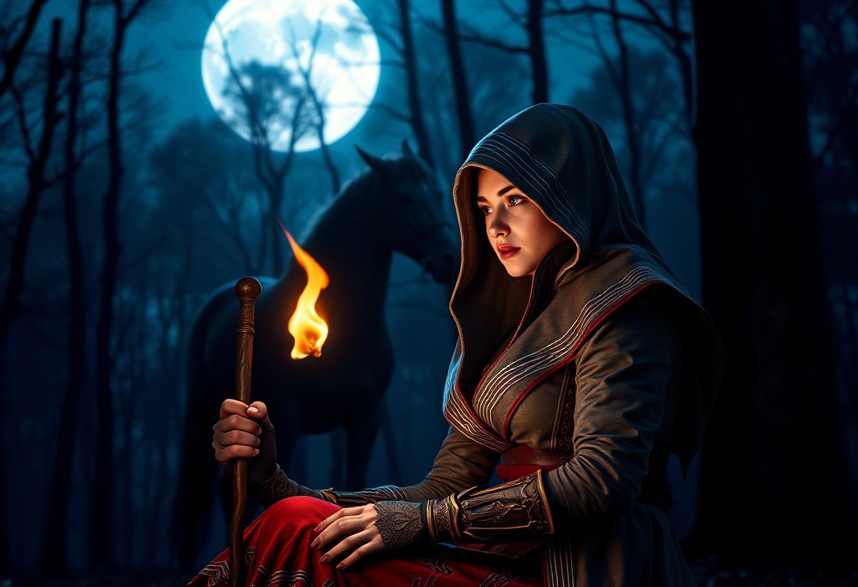 woman with assassin's Creed magic suit holding a magic stick in a dark forest ,the trees hide the light of the moon blue environment , sitting behind a flame, looking to the flame and a black horse behind , good details in the face