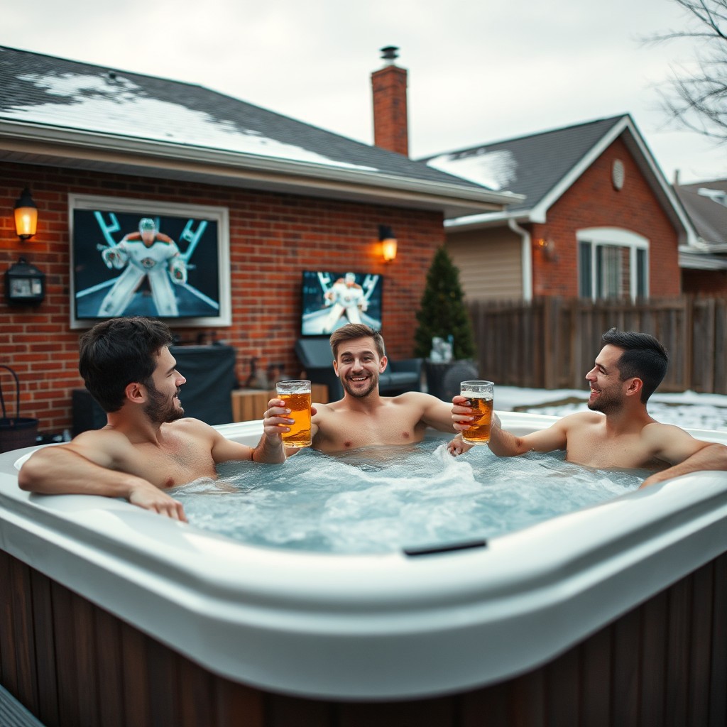 3 adult men sitting in hot tub, in their 20s, in a backyard next to a red brick house, holding beers, hockey playing on tv in background, all joking and having a good time, photo realistic
