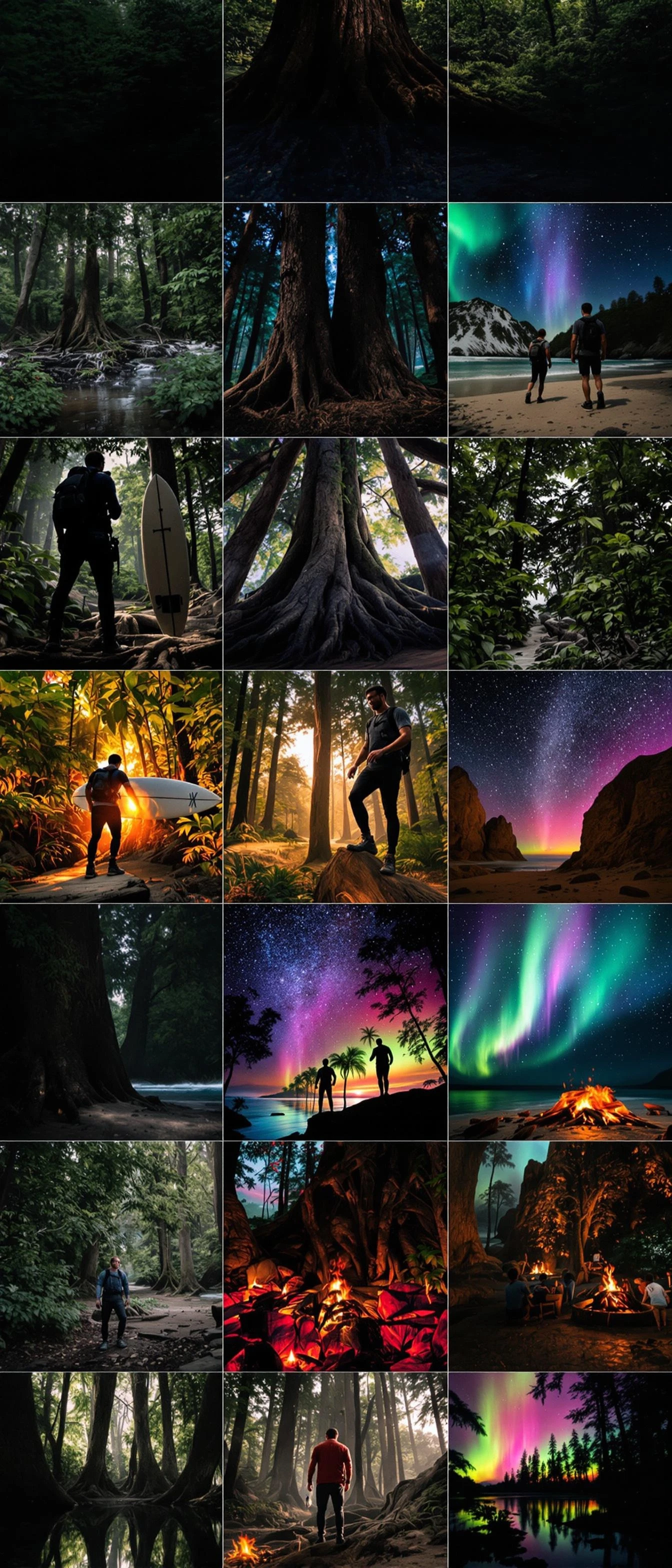 A complete Instagram puzzle feed layout showcasing the adventurous journey of an international influencer. The feed consists of 3 columns and multiple rows, forming a seamless vertical storytelling experience. Bottom Rows: The first row features 3 completely black squares, symbolizing the unknown and the beginning of the journey. The next 6 squares gradually reveal the roots of a massive tree emerging from the darkness, with earthy tones and detailed textures. Middle Rows: As the feed progresses, boots appear alongside the tree trunk, with the protagonist standing beside it, observing the tree. The perspective shifts upward, capturing the tree’s trunk and branches as light begins to filter in. The protagonist is shown in tropical forests with a serious expression, wearing dark hiking gear in earthy tones, blending seamlessly into the dense foliage. Transition Rows: Dawn breaks as he transitions to outdoor activities like running on a beach with a surfboard and surfing dynamic waves. Warm oranges and yellows dominate these rows. Kayaking, rock climbing, and hiking during golden hour are depicted next, with vibrant tones blending into purples. Top Rows: Nightfall begins as he gathers firewood and lights a campfire under a starry sky. He is dressed in cold-weather gear, with textures of rugged fabric visible. The final rows showcase him sitting by the fire with the Milky Way and a colorful aurora borealis above him. This breathtaking scene spans multiple squares for dramatic effect, tying together the narrative of exploration and connection to nature. Design Details: Each image is rendered in ultra-high resolution with seamless transitions between posts. The color palette evolves from dark earthy tones to warm oranges and purples, then deep blues and blacks for night scenes. Textures such as wood, fabric, foliage, and water are meticulously detailed for realism. The puzzle feed is designed to captivate followers with its refined aesthetic and immersive storytelling."