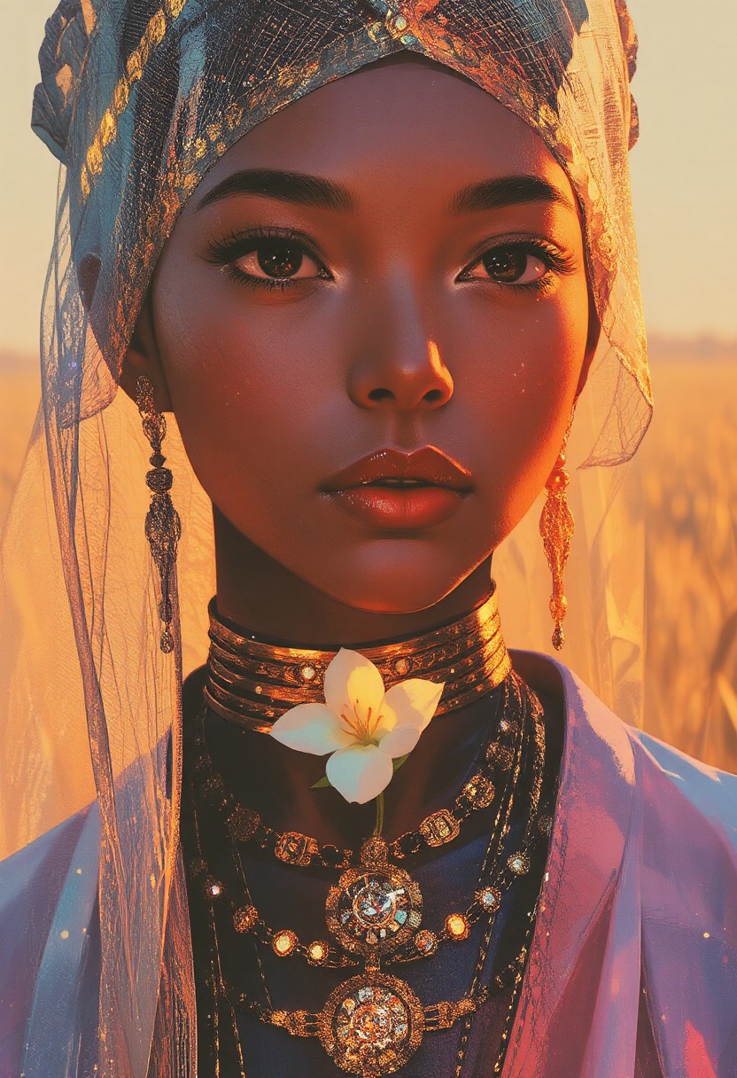 A close-up scene of an Korean woman’s face and neck, her brown Rajasthani skin glowing with a soft, oily, glossy sheen under golden light. She wears a transparent, intricate golden veil draped over her head, detailed like fine lace, shimmering with delicate patterns. Her black eyes are deep and calm, framed with sharp black eyeliner extending elegantly. Her lips are full, painted rich red, contrasting her luminous skin. Traditional Korean clothing wraps her neck and shoulders, adorned with sparkling gold ornaments — layered necklaces, ornate earrings, and forehead jewelry, each piece reflecting warm light with detailed craftsmanship. A soft white cotton flower rests within the frame near her neck, its texture delicate against the brilliance of her jewelry. Behind her, the background stretches into a blurred wheat paddy, golden fields swaying softly, merging with the sunlit atmosphere. The scene radiates timeless beauty, nature, and the regal grace of Rajasthani tradition.