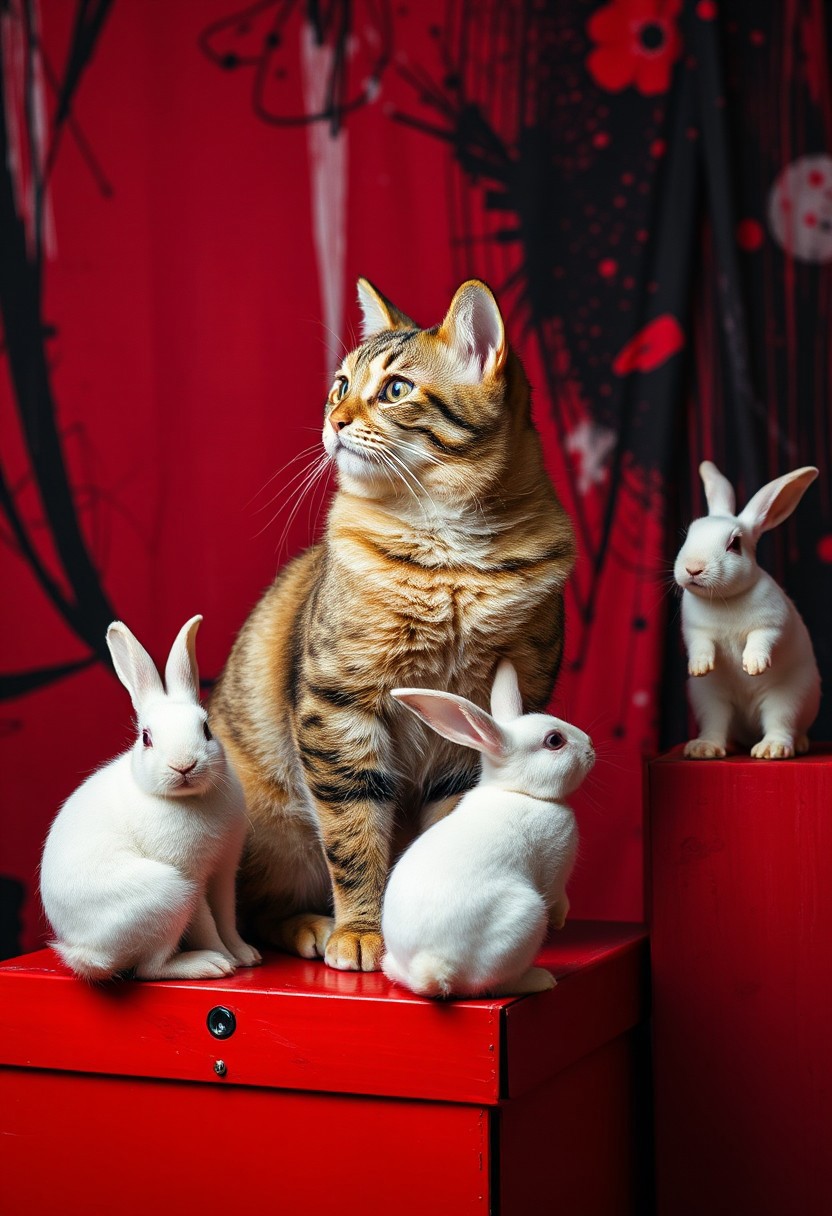 (Soft Lighting Photography by Mimoza Veliu and Mario Giacomelli:1.2), NSFW, A vibrant and colorful photo of a cat sitting on a red box, surrounded by two white rabbits. the cat is looking off to the side with a contemplative expression. the background is a mix of red and black, with abstract shapes and patterns. on the right side of the image, a small white rabbit is sitting on the box, looking up at the cat