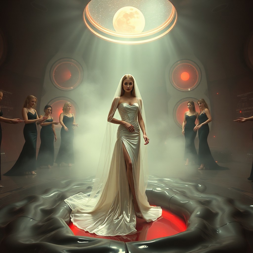 high-society elegant slender norvegian rich innocent young bride wearing glossy silver high heels and glossy transparent slime high slit wedding dress with matching long veil. She posing in center of the floor hole, filled with glossy black slime, surrounded by ladies wearing elegant black gowns and high heels, pulling her toward giant slime covered glossy red foil breeding bed, eerie fog that wafts up from the fleshy jelly floor, encased in light beam from the chamber celling, awaiting her alien master, strugging to break free and escape, glossy live wet-look jelly walls, whorish breeding chamber, colossus observation portholes to outer space full of stars, bright red moon, vintage-inspired makeup, long hairs, ultra thin waist, evil grin, porcelain skin, lipstick, red nails, in the style of a haunting, retro-futuristic 1950s sci-fi nightmare, horror, alien space base,