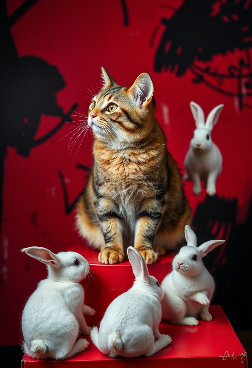 (Soft Lighting Photography by Mimoza Veliu and Mario Giacomelli:1.2), NSFW, A vibrant and colorful photo of a cat sitting on a red box, surrounded by two white rabbits. the cat is looking off to the side with a contemplative expression. the background is a mix of red and black, with abstract shapes and patterns. on the right side of the image, a small white rabbit is sitting on the box, looking up at the cat