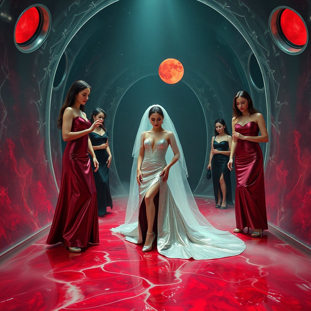 high-society elegant slender norvegian rich innocent young bride wearing glossy silver high heels and glossy transparent slime high slit wedding gown with matching long veil? surrounded by arrogant ladies wearing glamour glossy black evening gowns and glossy high heels, laying her in to weird glossy red foil breeding bed, eerie fog that wafts up from the fleshy jelly floor, encased in light beam from the chamber celling, awaiting her alien master, strugging to break free and escape, transparent crystal walls, colossus observation portholes to outer space full of stars, bright red moon, vintage-inspired makeup, long hairs, ultra thin waist, evil grin, porcelain skin, lipstick, red nails, in the style of a haunting, retro-futuristic 1950s sci-fi nightmare, horror, alien space base,