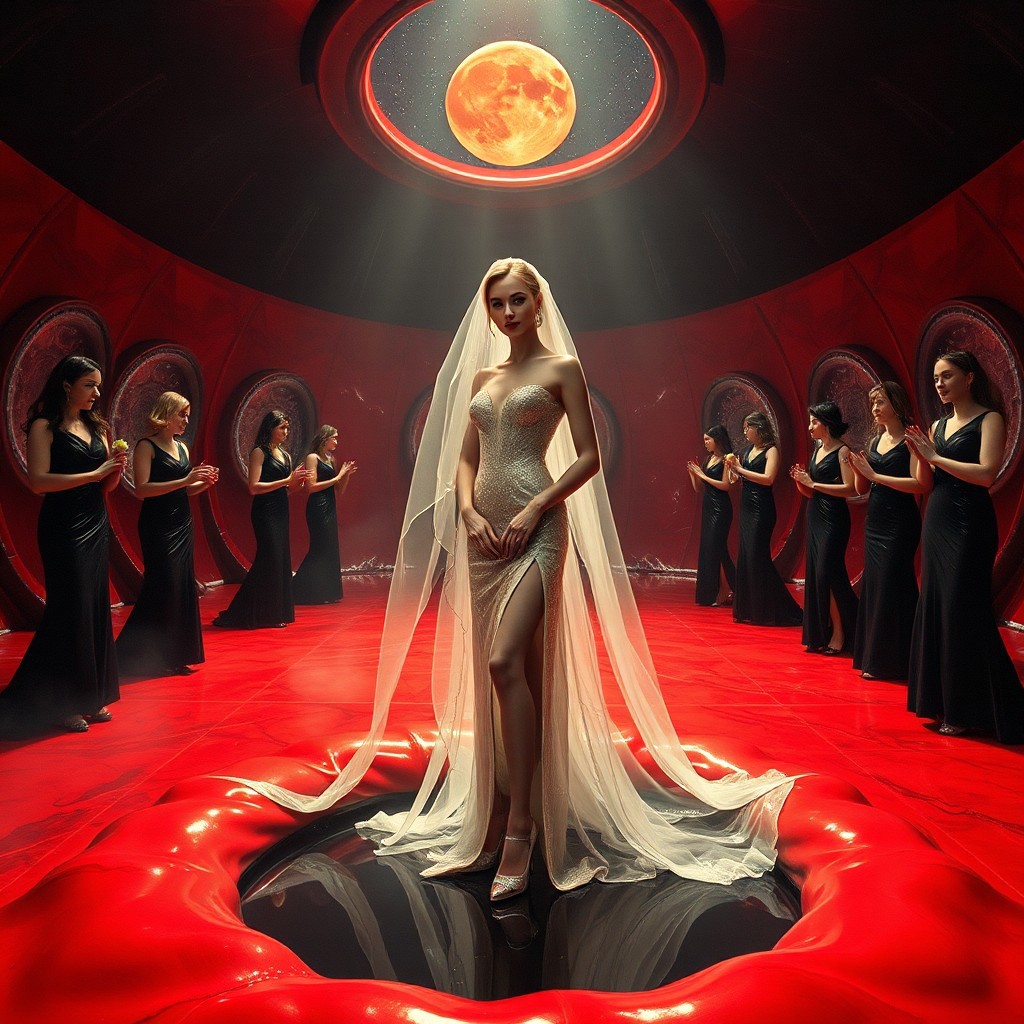 high-society elegant slender norvegian rich innocent young bride wearing glossy silver high heels and glossy transparent slime high slit wedding dress with matching long veil. She posing in center of the floor hole, filled with glossy black slime, surrounded by ladies wearing elegant black gowns and high heels, pulling her toward giant slime covered glossy red foil breeding bed, eerie fog that wafts up from the fleshy jelly floor, encased in light beam from the chamber celling, awaiting her alien master, strugging to break free and escape, glossy live wet-look jelly walls, whorish breeding chamber, colossus observation portholes to outer space full of stars, bright red moon, vintage-inspired makeup, long hairs, ultra thin waist, evil grin, porcelain skin, lipstick, red nails, in the style of a haunting, retro-futuristic 1950s sci-fi nightmare, horror, alien space base,
