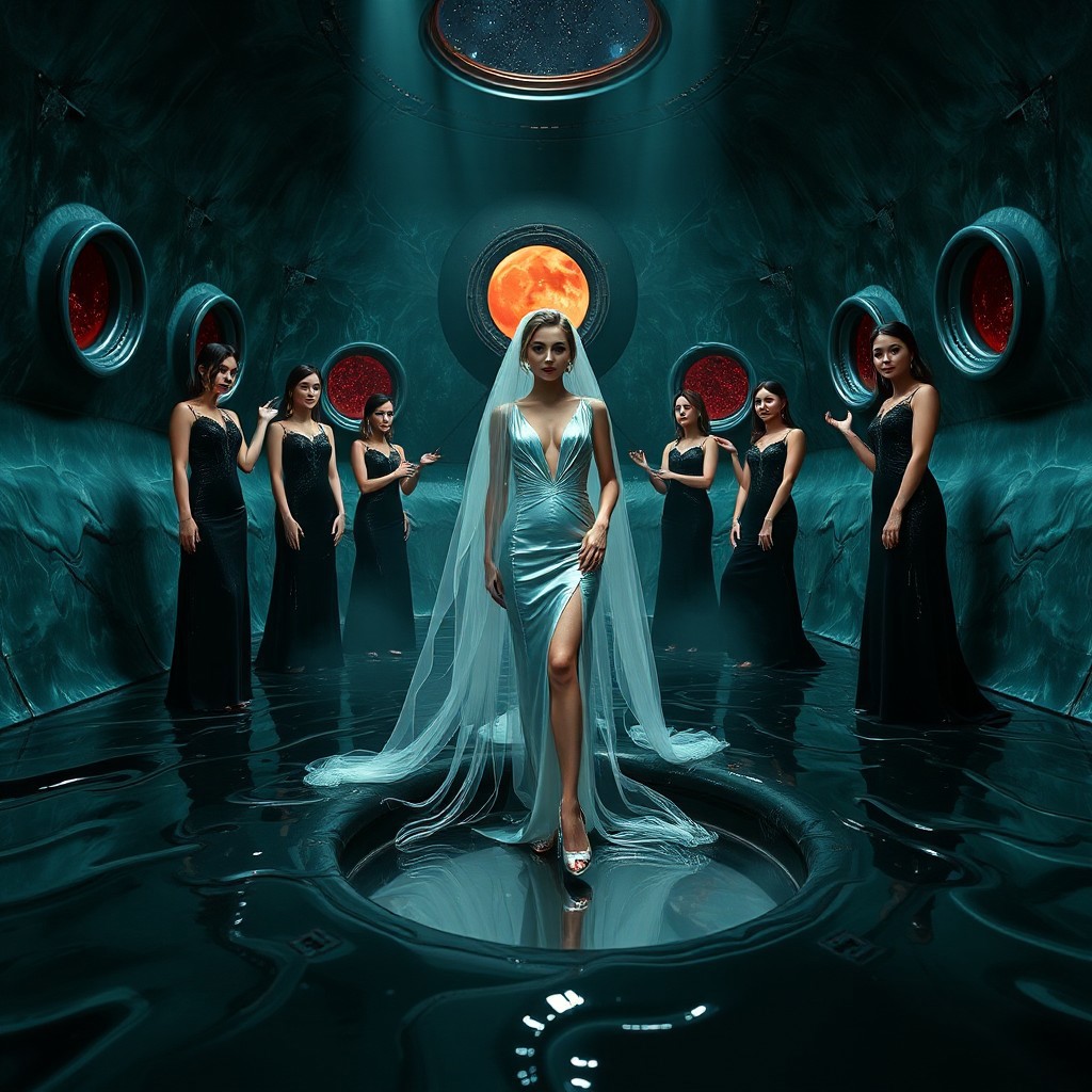 high-society elegant slender norvegian rich innocent young bride wearing glossy silver high heels and glossy transparent slime high slit wedding gown with matching long veil. She posing in center of the floor hole, filled with glossy black slime, surrounded by arrogant ladies wearing elegant black gowns and high heels, pulling her toward giant slime covered glossy red foil breeding pillow, eerie fog that wafts up from the fleshy jelly floor, encased in light beam from the chamber celling, awaiting her alien master, strugging to break free and escape, glossy live wet-look jelly walls, whorish breeding chamber, colossus observation portholes to outer space full of stars, bright red moon, vintage-inspired makeup, long hairs, ultra thin waist, evil grin, porcelain skin, lipstick, red nails, in the style of a haunting, retro-futuristic 1950s sci-fi nightmare, horror, alien space base,