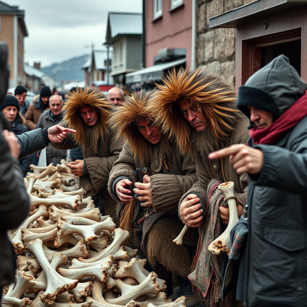 A realistic image of some ragged looking inuit merchants selling bones in the streets of Hjerkinn in Norway, spectators looking angry at them and pointing fingers agressively and accusingly