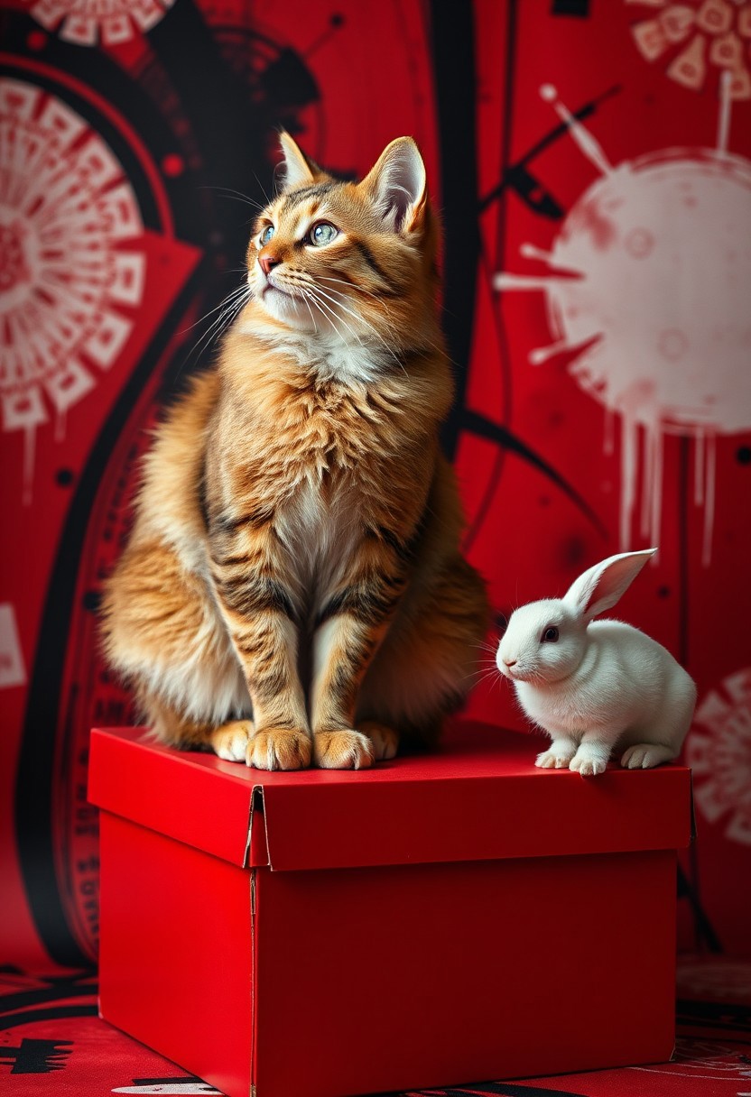 (Soft Lighting Photography by Mimoza Veliu and Mario Giacomelli:1.2), NSFW, A vibrant and colorful photo of a cat sitting on a red box, surrounded by two white rabbits. the cat is looking off to the side with a contemplative expression. the background is a mix of red and black, with abstract shapes and patterns. on the right side of the image, a small white rabbit is sitting on the box, looking up at the cat