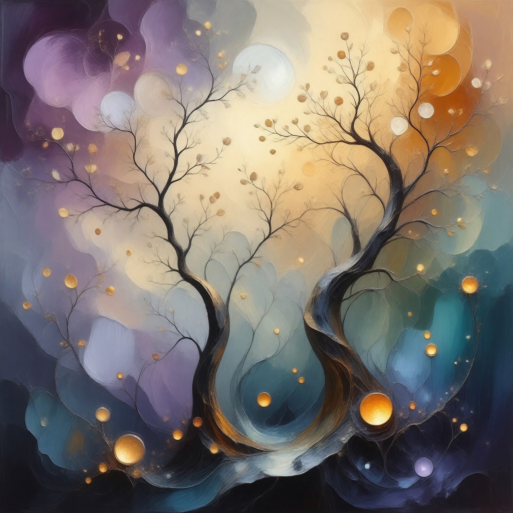 Organic abstraction of interconnected life forms and cosmic threads — sacred geometry meets dreamlike growth patterns — in the style of Gustav Klimt, Android Jones, and Odilon Redon, blending radiant golds, violet haze, and shimmering teal textures.