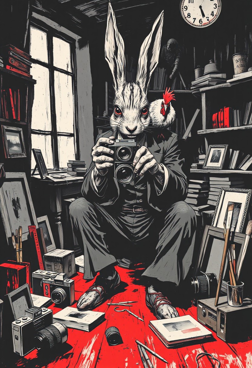 hariren. An anthropomorphic evil rabbit in a ragged suit sat in a dark, shabby tailor's shop pointing a vintage Hasselblad camera at the viewer. On his shoulder is a chicken. The rabbit's fur is matted and rough. Its eyes are scary. The rabbit, chicken and the camera are all pointing forward to the viewer. On the floor are vintage cameras, books, picture frames and paintbrushes. The brushwork is kept minimal, using bold, unshaded forms, rough-edged shapes, and grainy textures for a powerful, rebellious aesthetic. The entire scene is rendered in a bold, minimalist aesthetic, using stark contrasts of white, black and red.
