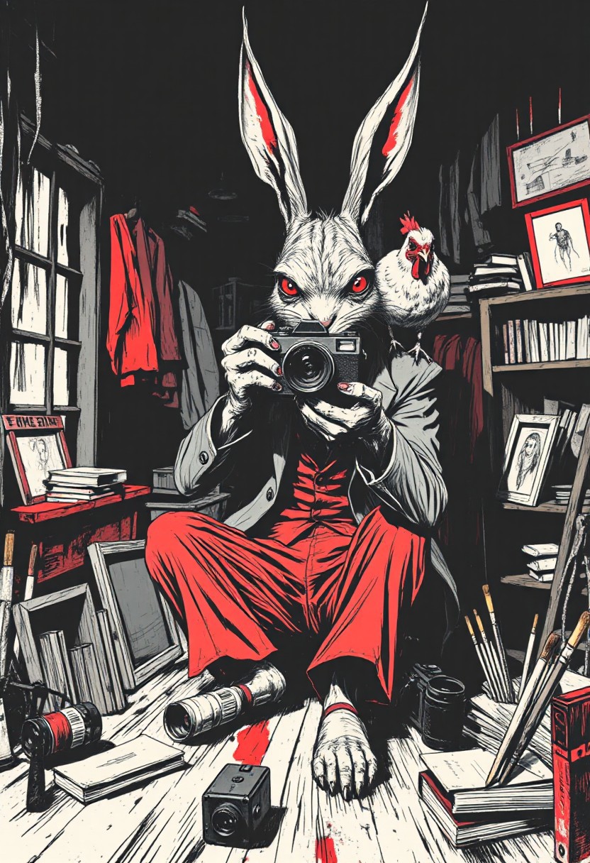 hariren. An anthropomorphic evil rabbit in a ragged suit sat in a dark, shabby tailor's shop pointing a vintage Hasselblad camera at the viewer. On his shoulder is a chicken. The rabbit's fur is matted and rough. Its eyes are scary. The rabbit, chicken and the camera are all pointing forward to the viewer. On the floor are vintage cameras, books, picture frames and paintbrushes. The brushwork is kept minimal, using bold, unshaded forms, rough-edged shapes, and grainy textures for a powerful, rebellious aesthetic. The entire scene is rendered in a bold, minimalist aesthetic, using stark contrasts of white, black and red.