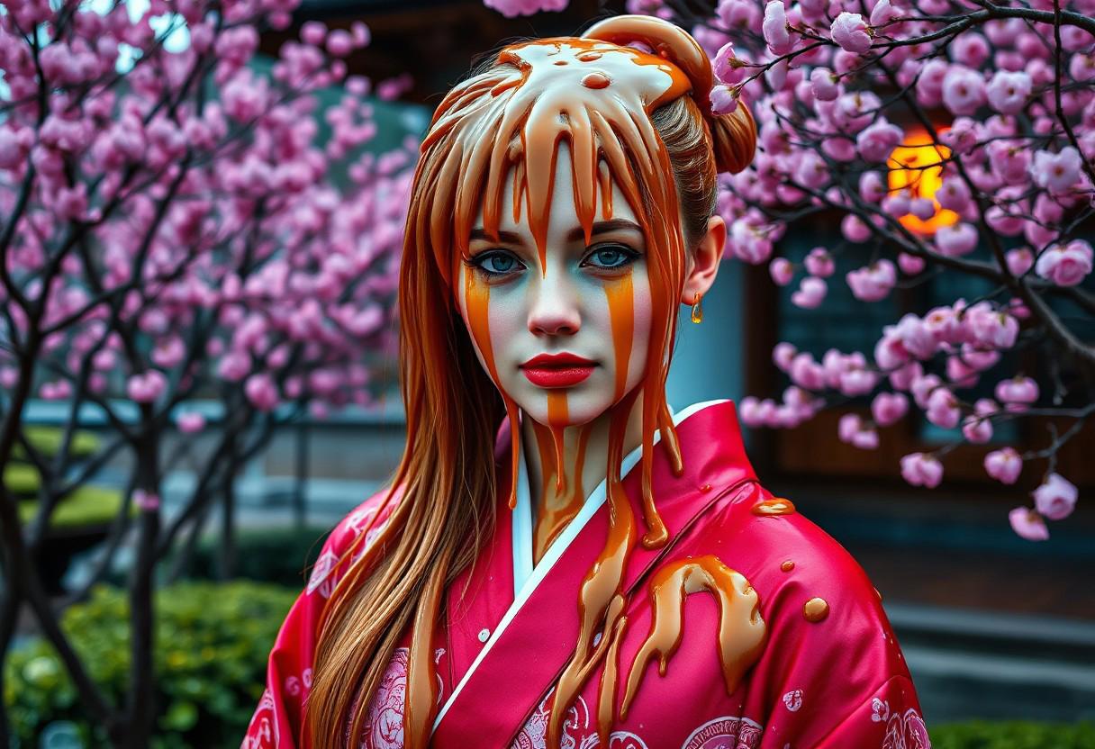 A 30 year old beautiful japanese women with green eyes and full long caramel hair stands in a traditional japanese garden. The woman is fully covered in sweet sticky glassy caramel. Her face is made of caramel and her hair looks frozen in hardening caramel. tradtitional japanese garden in the spring with pink cherry blossom trees. the woman wears a beautiful red and pink kimono that is messed with caramel that is dripping down her face and hair. neon futuristic colours.