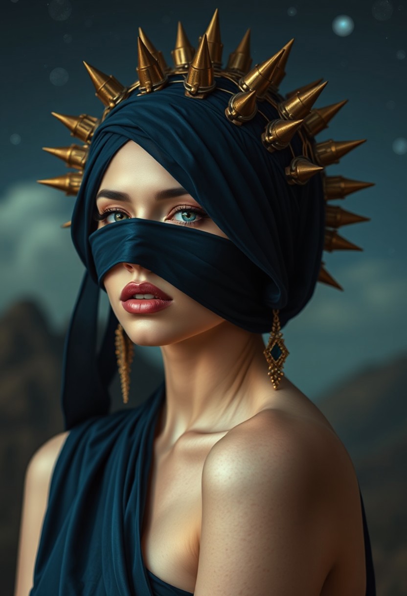 lady in midnight blue veils her face and has a large bronze spiked crown, in the style of celestial fashion, otherworldly beauty, davide sorrenti, celestial punk, album covers, fra angelico, aykut aydogdu, queen core, golden age aesthetics