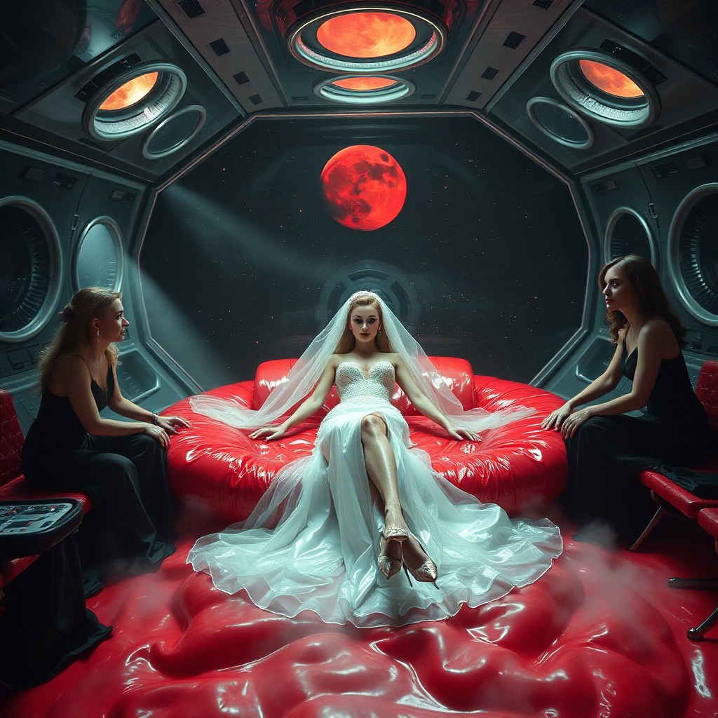 high-society elegant slender norvegian rich innocent young bride wearing glossy silver high heels and glossy transparent slime high slit wedding gown with matching long veil, laying in whorish lush glossy red foil breeding bed in center of alien breeding space capsule, legs spreade wide apart by by arrogant ladies wearing glamour glossy black evening gowns and glossy high heels, sitting and holding her legs and arms, eerie fog that wafts up from the fleshy jelly floor, encased in light beam from the chamber celling, awaiting her alien master, strugging to break free and escape, transparent crystal walls, colossus observation portholes to outer space full of stars, bright red moon, vintage-inspired makeup, long hairs, ultra thin waist, evil grin, porcelain skin, lipstick, red nails, in the style of a haunting, retro-futuristic 1950s sci-fi nightmare, horror, alien space base,