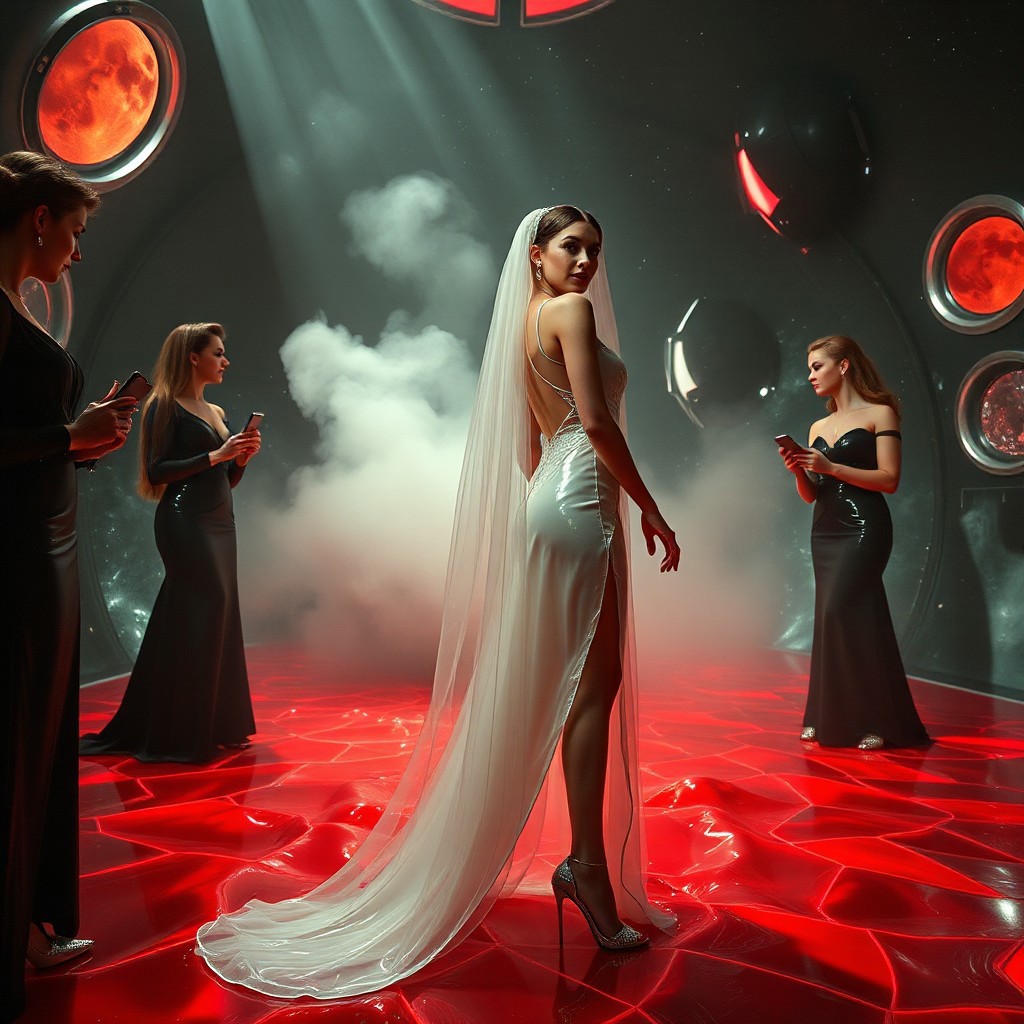 high-society elegant slender norvegian rich innocent young bride wearing glossy silver high heels and glossy transparent slime high slit wedding gown with matching long veil? surrounded by arrogant ladies wearing glamour glossy black evening gowns and glossy high heels, laying her in to weird glossy red foil breeding bed, eerie fog that wafts up from the fleshy jelly floor, encased in light beam from the chamber celling, awaiting her alien master, strugging to break free and escape, transparent crystal walls, colossus observation portholes to outer space full of stars, bright red moon, vintage-inspired makeup, long hairs, ultra thin waist, evil grin, porcelain skin, lipstick, red nails, in the style of a haunting, retro-futuristic 1950s sci-fi nightmare, horror, alien space base,
