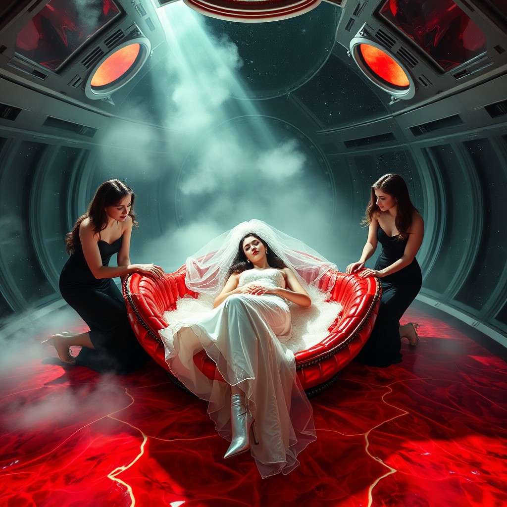 high-society elegant slender norvegian rich innocent young bride wearing glossy silver high heels and glossy transparent slime high slit wedding gown with matching long veil, laying in whorish lush glossy red foil breeding bed in center of alien breeding space capsule, surrounded by arrogant ladies wearing glamour glossy black evening gowns and glossy high heels, kneeling over her and holding her legs and arms, eerie fog that wafts up from the fleshy jelly floor, encased in light beam from the chamber celling, awaiting her alien master, strugging to break free and escape, transparent crystal walls, colossus observation portholes to outer space full of stars, bright red moon, vintage-inspired makeup, long hairs, ultra thin waist, evil grin, porcelain skin, lipstick, red nails, in the style of a haunting, retro-futuristic 1950s sci-fi nightmare, horror, alien space base,